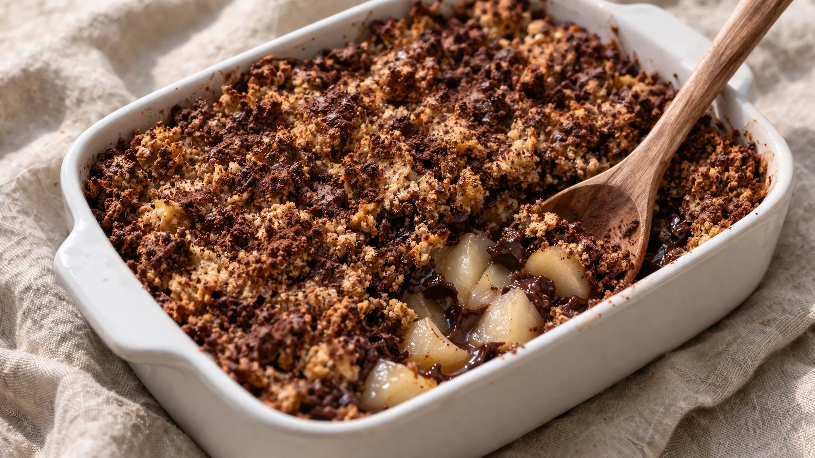 Le duo poire-chocolat est l'un des grands classiques de la pâtisserie française, et pour cause : la douceur naturellement sucrée et parfumée de la poire se marie parfaitement avec l'amertume du cacao. En version crumble, cette alliance prend une dimension supplémentaire grâce à la texture contrastée entre les fruits fondants et la chapelure croustillante. Choisissez des poires Williams ou Conférence à juste maturité, pas trop molles, pour qu'elles tiennent à la cuisson.