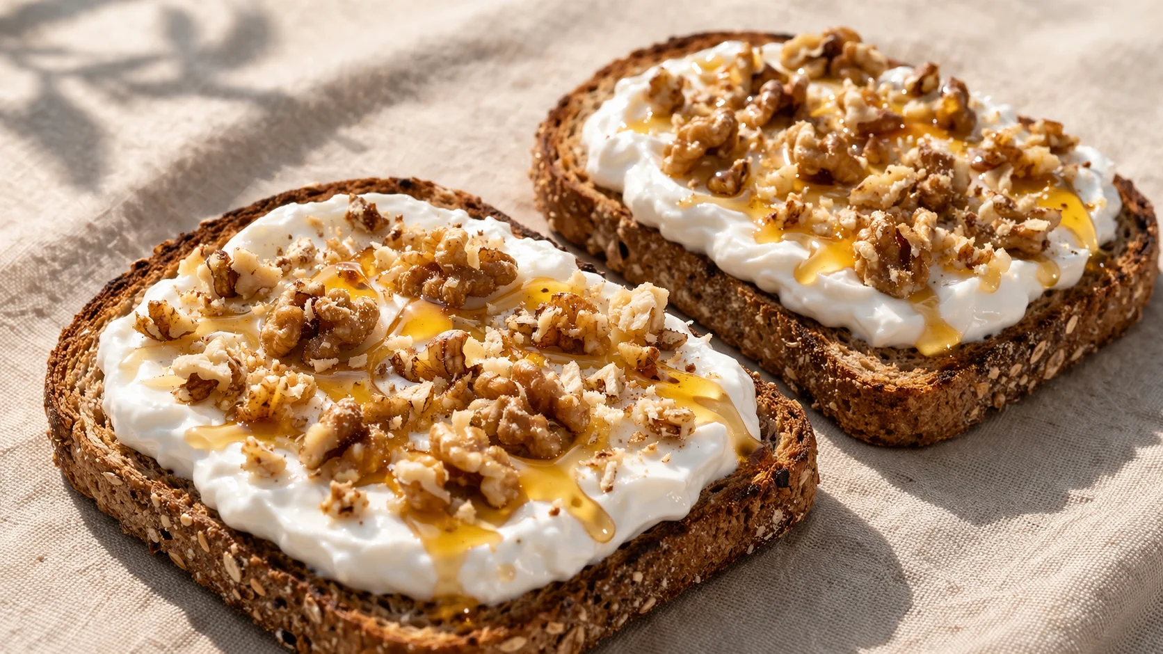 Le fromage blanc est l'un des produits laitiers les plus sous-estimés de la cuisine française. Naturellement riche en protéines, pauvre en graisses dans sa version 0 %, et doté d'une texture fraîche et légèrement acidulée qui s'associe parfaitement avec le sucré du miel et l'amertume légère des noix. Choisissez un fromage blanc bien épais, si possible égoutté, pour éviter qu'il ne dégoutte immédiatement sur le pain : la texture est meilleure et il tient davantage à la dégustation.